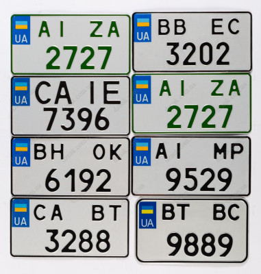 Квадратные номера в Украине имеют размер 150 мм на 300 мм. На этот тип номеров можно печатать цифры из предыдущей серии автознаков.
